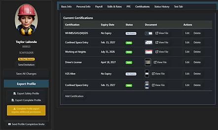 Scaffold Insite efficiently manages employee certifications and PPE requirements, proactively tracking expirations and simplifying employee onboarding. Profiles and documentation are easily exported, ensuring workforce readiness prior to site mobilization.